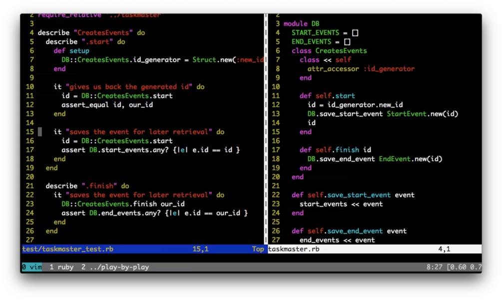 You'll see me constantly running tests from Vim, attempting to keep everything green while turning a prototype-quality codebase into something (hopefully!) more understandable and maintainable.